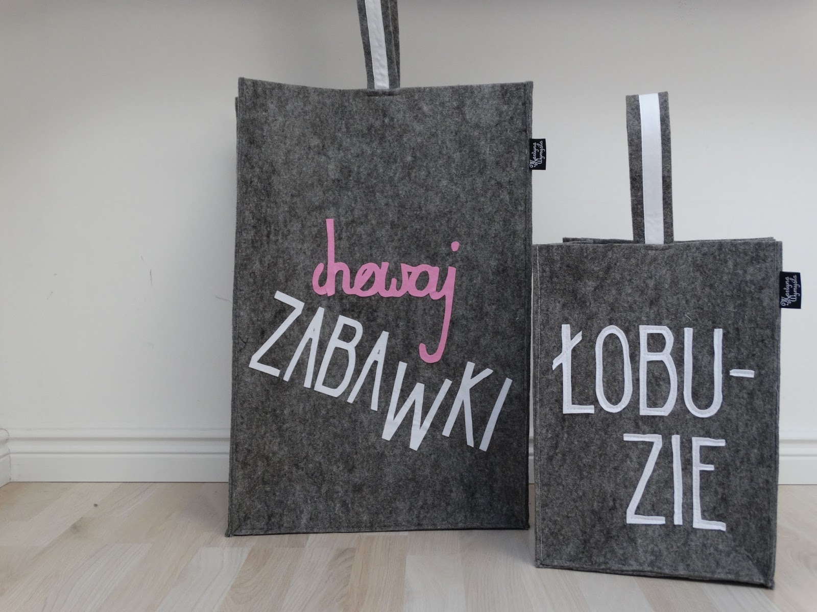 Tak powstały filcowe worki na zabawki. Są duże i bardzo pakowne, a przez długaśne uchwyty super wygodne, bo my ciągamy je w tą i z powrotem... między salonem, a pokojem Tośki .... na okrągło :).