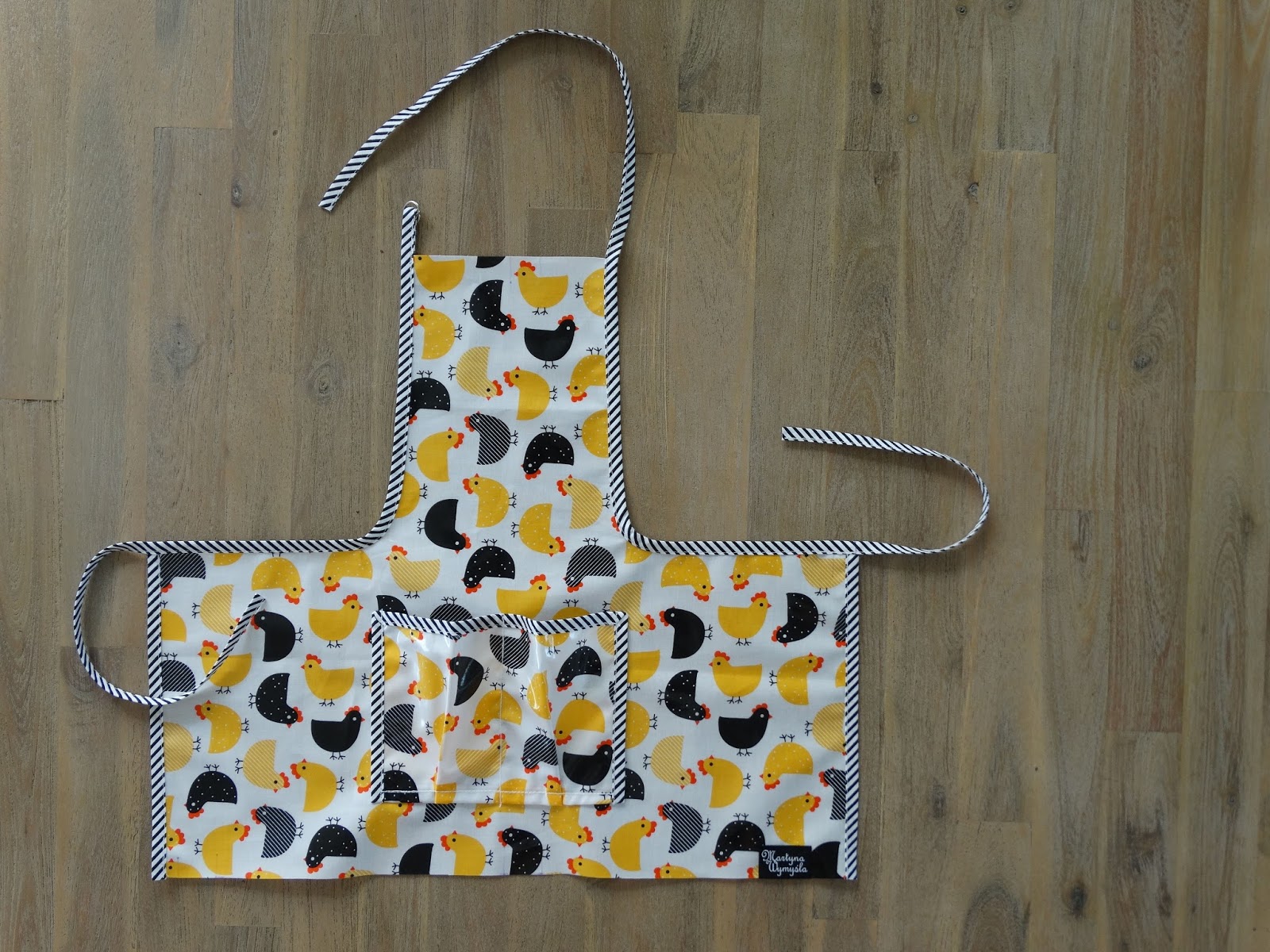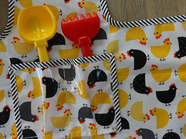 Tkanina z zewnętrznej strony pokryta jest cienką warstwą laminatu, dzięki czemu fartuszek można zetrzeć mokrą szmatką i oczywiście chroni małe ogrodniczki przed tym co wyleciało z konewki, a niekoniecznie poleciało w odpowiednim kierunku :))).