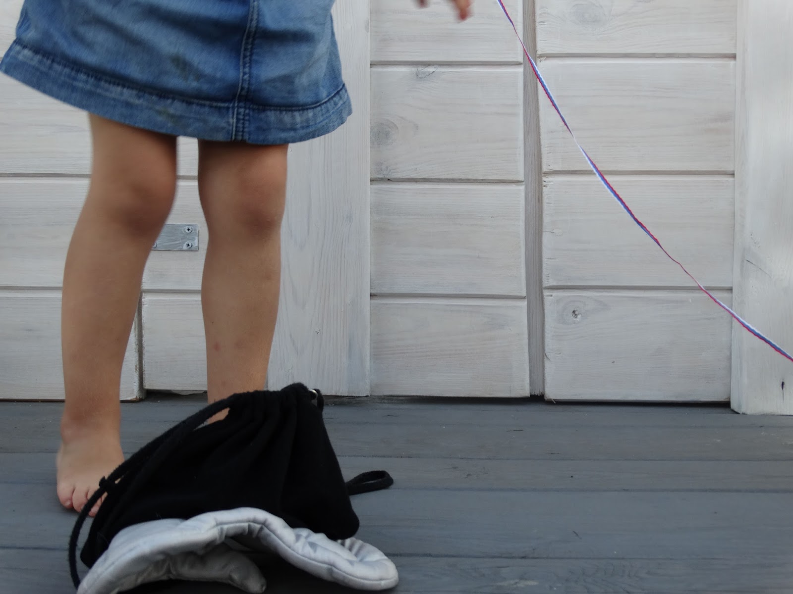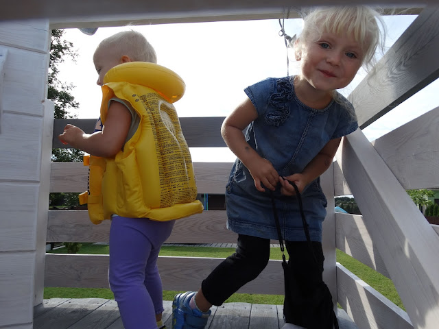 Tosia ostatnio ma fazę, że biega wszędzie ze swoim plecaczkiem. Jest mi bardzo miło, bo to produkcja mamuni. Natomiast Pola w dmuchanej kamizelce. Może bawi się w rozbitka?!:) Jeżeli tak starsza siostra na pewno uratuje ją za każdym razem :)).