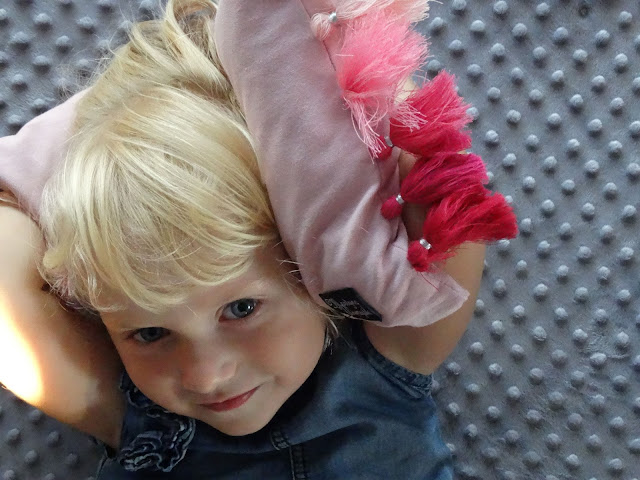 Okazało się, że do drzemki w wakacyjnym przedszkolu są potrzebne własne podusie. Tosia wybrała sobie taką :). Nową z chwostami, gęsto przyszywanymi, dlatego stworzyły mega fajne frędzle, w dodaku ombre.... Rozumiem jej wybór :).