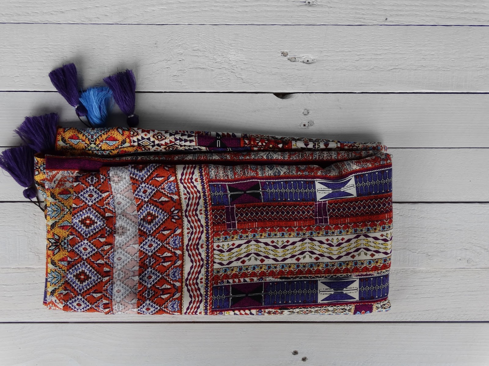Ta chusta jest zrobiona z bardzo miłej dla skóry wiskozy. Ozdobiona 6 ręcznie robionymi chwostami, które dodają jej nieco egzotyczny wygląd.