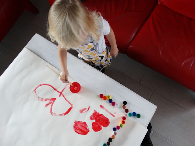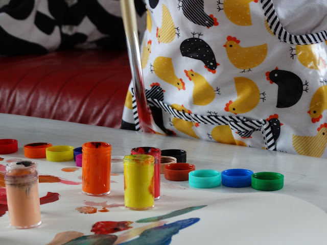 Tosia zaczyna łapać podstawy w mieszaniu farb, no i wyczułam w niej wreszcie odruch "czystej" pracy, czystych kolorów, porządnie płukanie pędzla. No i mam teraz co chciałam....co zmiana koloru słyszę "Mamo proszę o świeżą wodę".