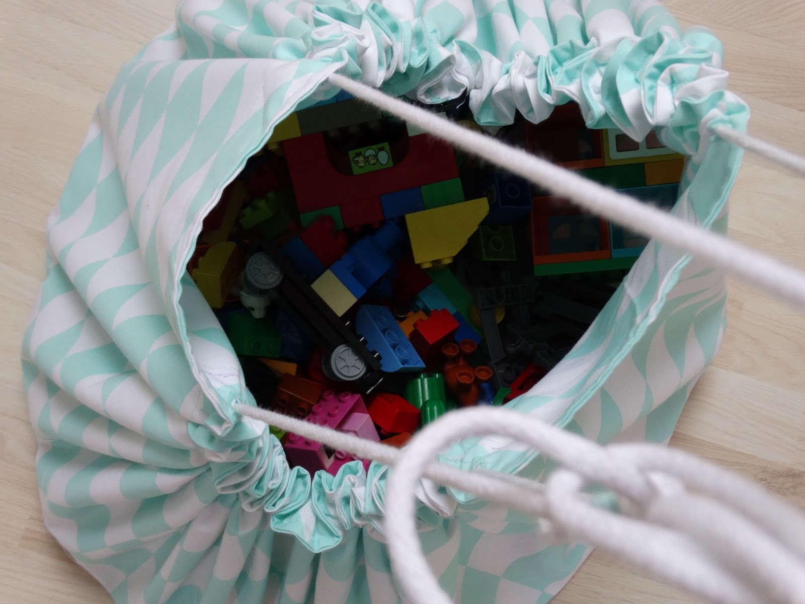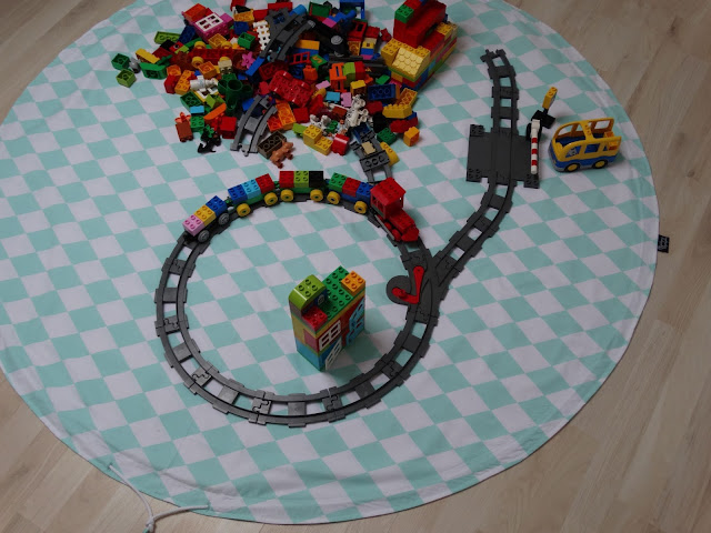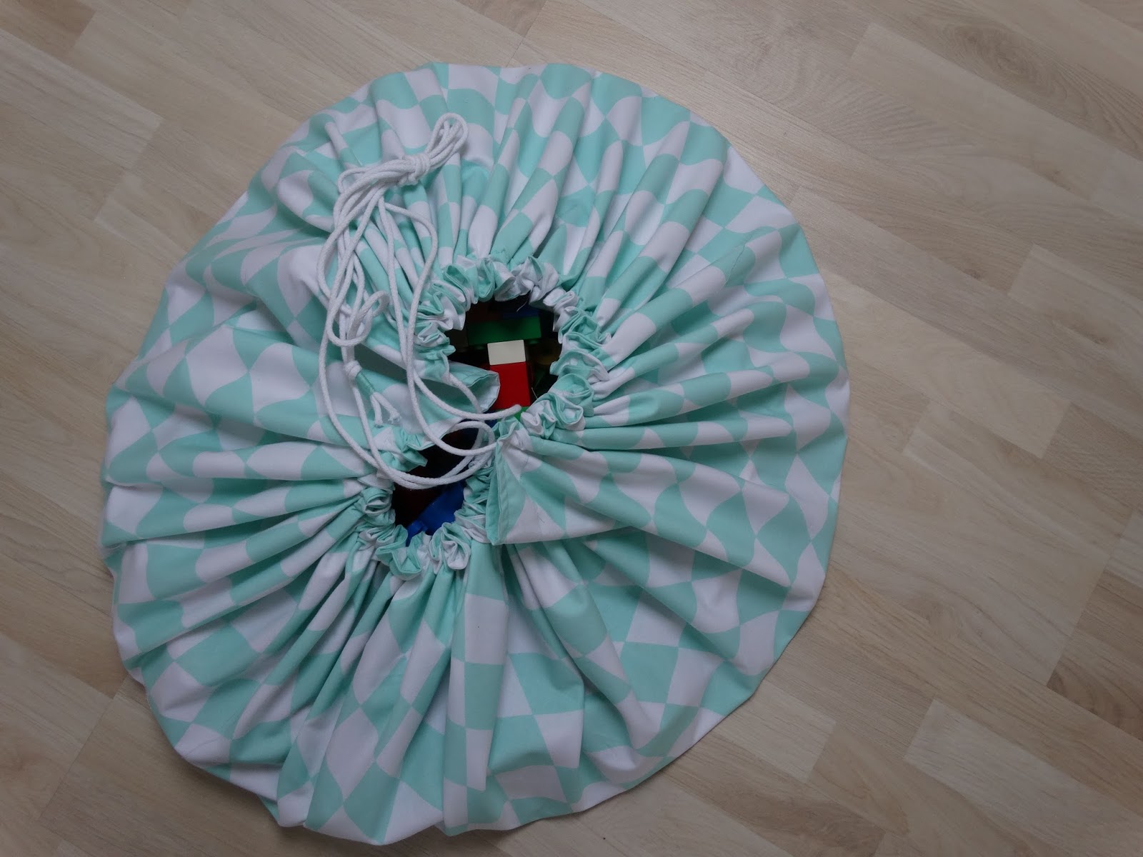 Dlatego fajnie jest mieć worek na klocki. Kiedy się bawimy zmienia się w matę, kiedy kończymy worek zamykamy i sprawa sprzątania załatwiona. Można go powiesić na jakimś haczyku, czy wsunąć pod łóżeczko.